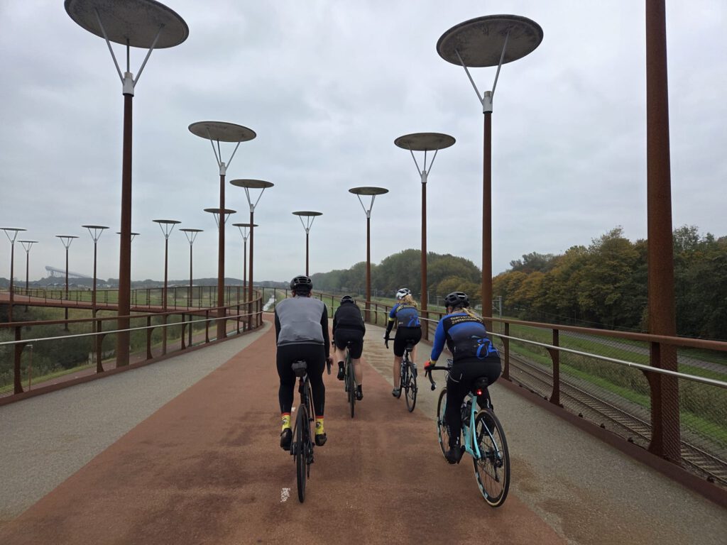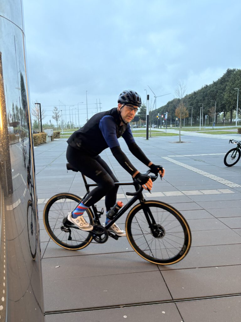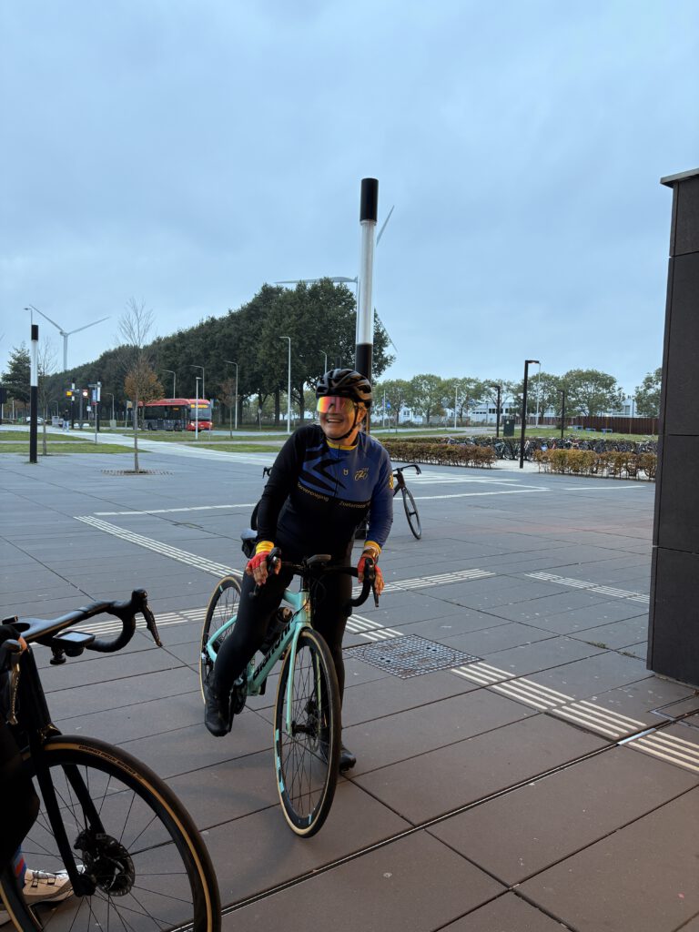 Bij het station was het droog, en mijn humeur droogde mee. Rob kwam al snel, Martijn volgde. Ingrid kwam aangesneld met de verkeerde handschoenen en een hartslagbandprobleem, maar dat was snel opgelost. Nu nog wachten op Romy… maar ja, wat is nieuw 😊
