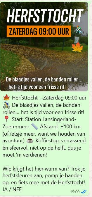 Dus ik flanste een poster in elkaar met een weg vol herfstbladeren en plaatste die in de groep. De reacties? Jaaa!, JA, Yes, Ik ben erbij! Maar ook twee keer een ‘nee’. Ach, we hadden in ieder geval een gezellig groepje van vijf.