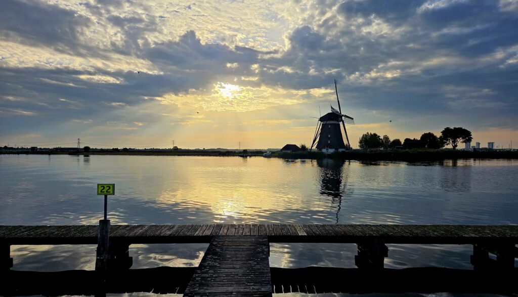 Ook Martijn was lekker op tijd en al kletsend reden we richting de Rotte en het zonnetje kwam nu door wat een mooie lucht gaf dus even stoppen voor een foto.