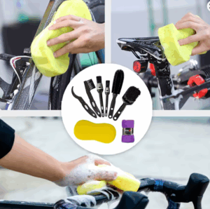 Ook de wielen, cassette en remschijven maak ik schoon met Dasty. Daarna spoel ik ze af met schoon water, en spoel ik ze nog na met het Wash & Shine-water. Vervolgens spons ik ze droog en blaas ik ze nog even na met de compressor.