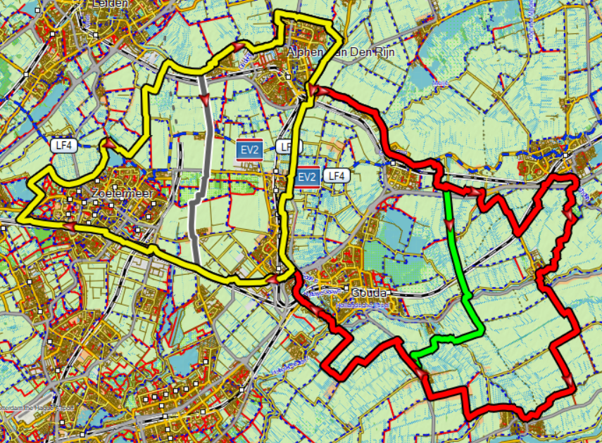 Splitsingen en het Grotere Werk We rijden richting Alphen aan den Rijn via een rustige buurtweg, langs het Zegersbos en de Zegersplassen een stukje route waar de herfst zich van z’n mooiste kant laat zien. Vlak voor Alphen komt de eerste splitsing: de 45 km-route buigt hier af richting het Bentwoud en keert terug naar Zoetermeer. Aan de andere kant van Alphen volgt de tweede splitsing: de 65 km-route gaat via Boskoop en Waddinxveen terug naar Zoetermeer. Maar wij? Wij gaan nog even door. Op naar Bodegraven, voor wie het volle herfstpakket wil proeven.