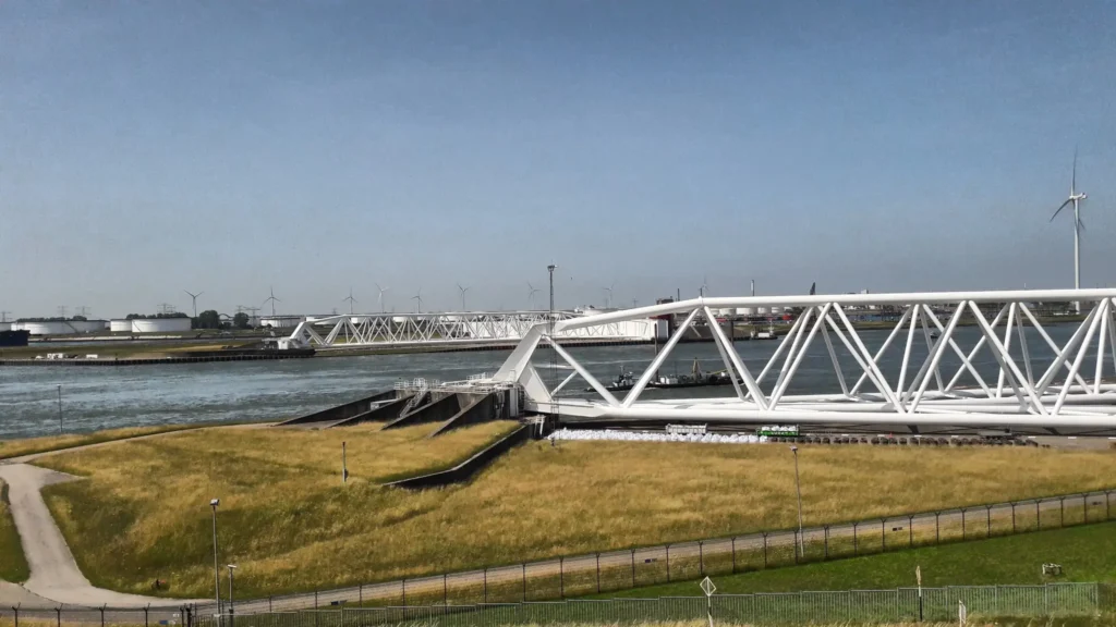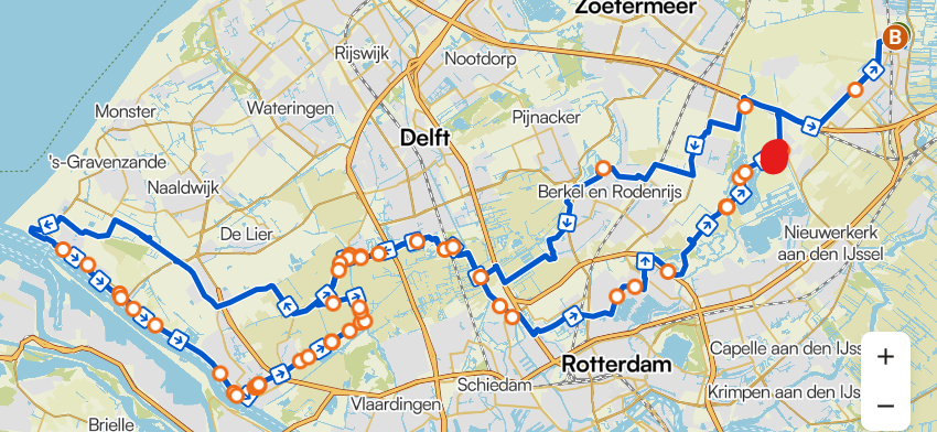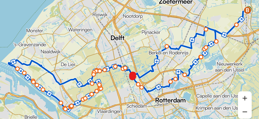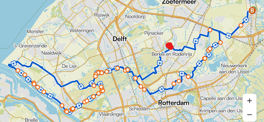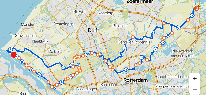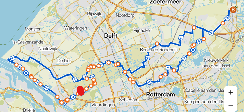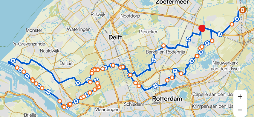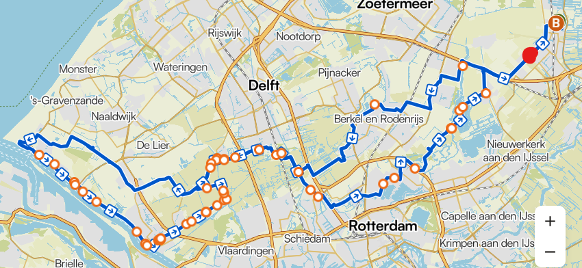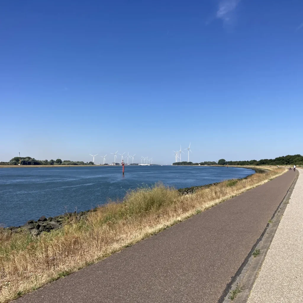 Op 62 km ben ik bij de Maeslantkering. Van dichtbij zie je pas hoe groot dat bouwwerk is. Het beschermt onder andere Rotterdam tegen overstromingen. Je kunt daar ook wat hoogtemeters maken: een stevige klim brengt je naar een mooi uitzichtpunt, gevolgd door een snelle afdaling waar ze in de Alpen jaloers op zouden zijn.