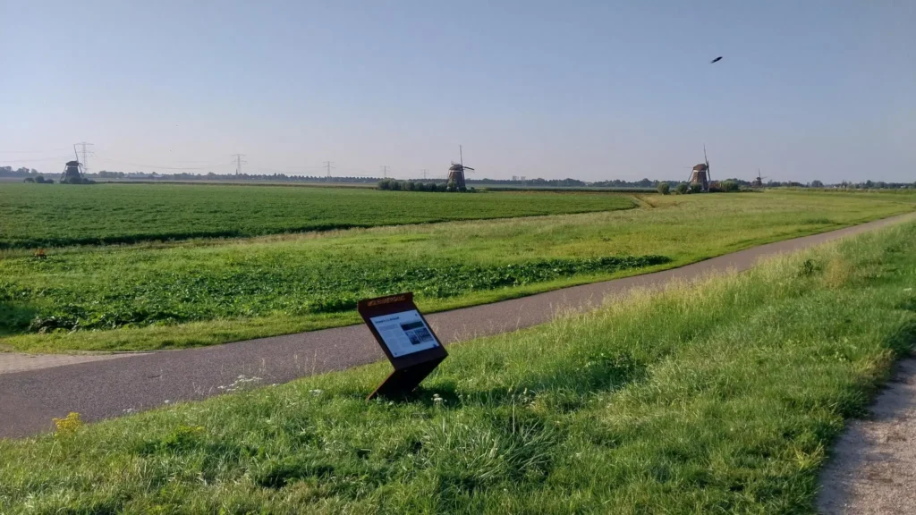 Op 10 km maak ik de eerste foto: een mooi uitzicht over het gebied van de Rotte, met in de verte de molens.